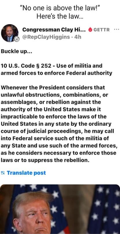 "No one is above the law!" Here's the law... Buckle up... 10 U.S. Code § 252 - Use of militia and armed forces to enforce Federal authority Whenever the President considers that unlawful obstructions, combinations, or assemblages, or rebellion against the authority of the United States make it impracticable to enforce the laws of the United States