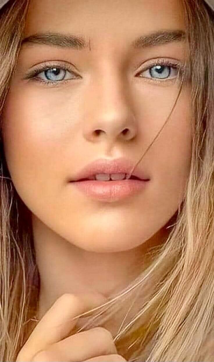 A close-up portrait of a young woman with long, wavy blonde hair and blue eyes. She has light makeup, a soft pink lip, and is wearing a light-colored jacket. She is touching a delicate necklace with a small pendant.