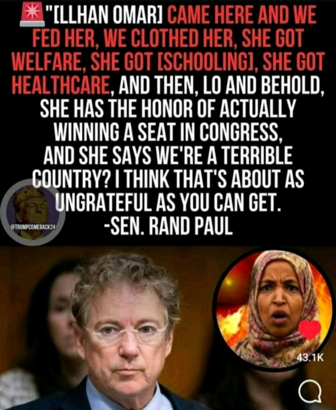 "[ILHAN OMAR] CAME HERE AND WE FED HER, WE CLOTHED HER, SHE GOT WELFARE, SHE GOT [SCHOOLING], SHE GOT HEALTHCARE, AND THEN, LO AND BEHOLD, SHE HAS THE HONOR OF ACTUALLY WINNING A SEAT IN CONGRESS, AND SHE SAYS WE'RE A TERRIBLE COUNTRY? I THINK THAT'S ABOUT AS UNGRATEFUL AS YOU CAN GET. - SEN. RAND PAUL"