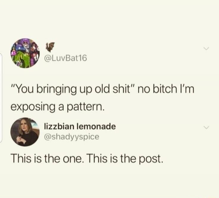 "You bringing up old shit" no bitch I’m exposing a pattern. lizzbian lemonade @shadyspice This is the one. This is the post.