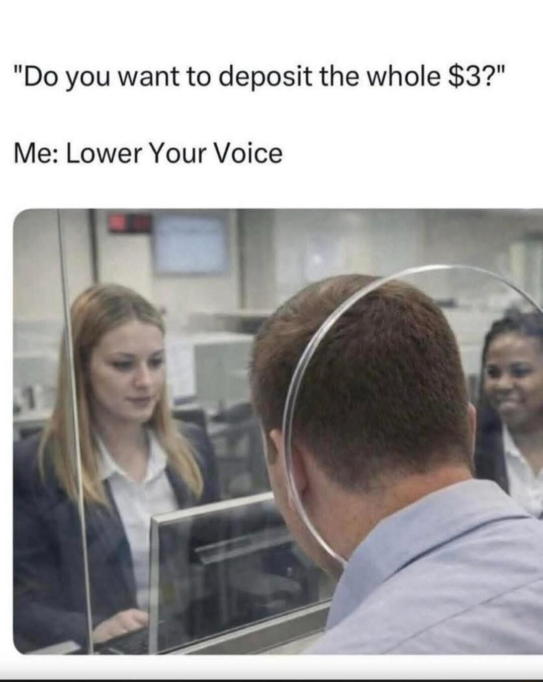 "Do you want to deposit the whole $3?" Me: Lower Your Voice