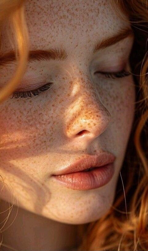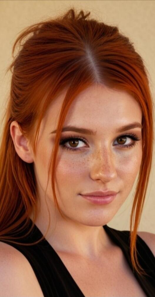 A portrait of a woman with red curly hair.