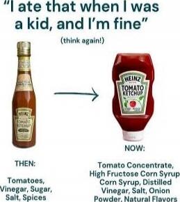 "I ate that when I was a kid, and I'm fine" (think again!) THEN: Tomatoes, Vinegar, Sugar, Salt, Spices NOW: Tomato Concentrate, High Fructose Corn Syrup, Corn Syrup, Distilled Vinegar, Salt, Onion Powder, Natural Flavors
