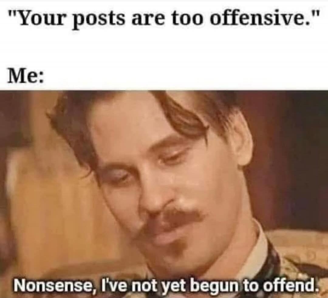 "Your posts are too offensive."\nMe:\nNonsense, I've not yet begun to offend.