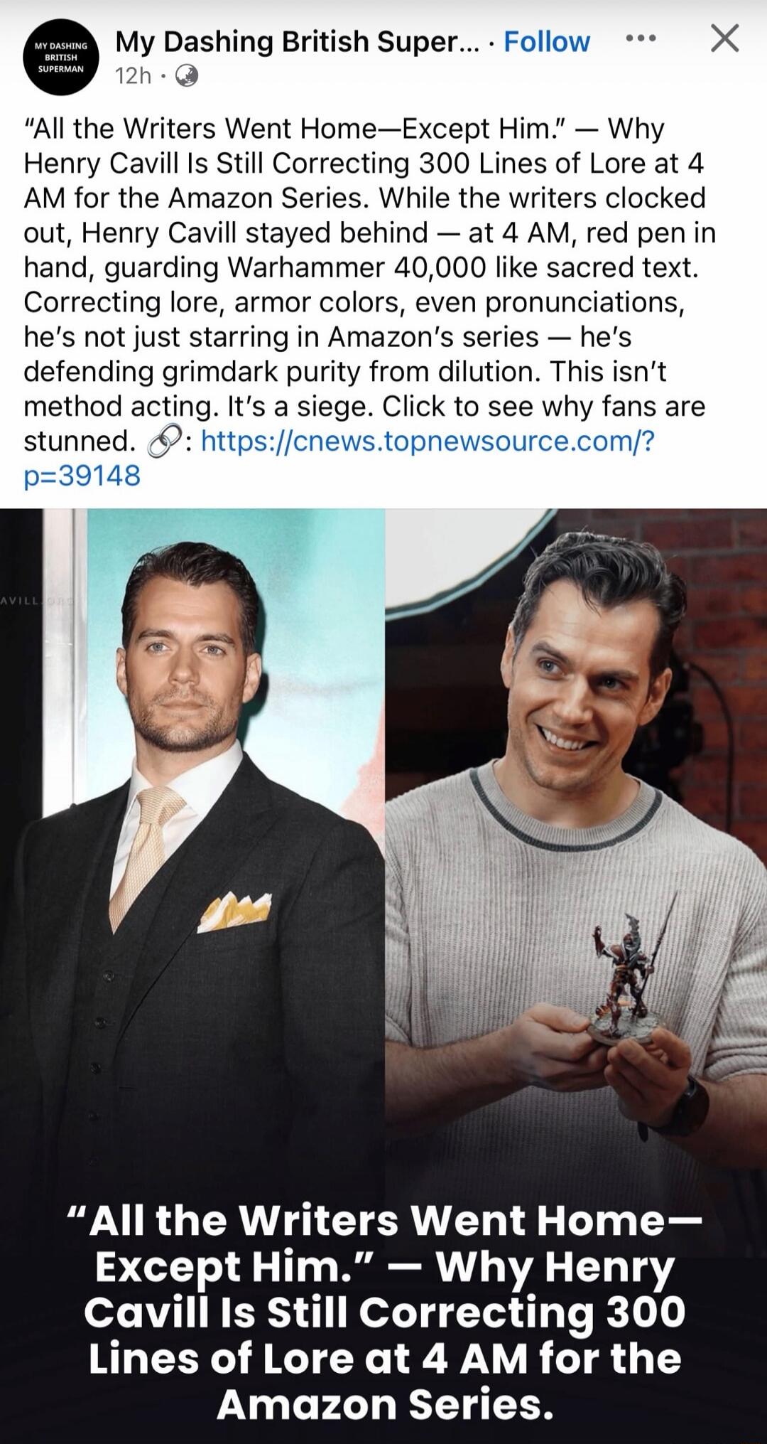 "All the Writers Went Home—Except Him." — Why Henry Cavill Is Still Correcting 300 Lines of Lore at 4 AM for the Amazon Series. While the writers clocked out, Henry Cavill stayed behind — at 4 AM, red pen in hand, guarding Warhammer 40,000 like sacred text. Correcting lore, armor colors, even pronunciations, he’s not just starring in Amazon’s serie