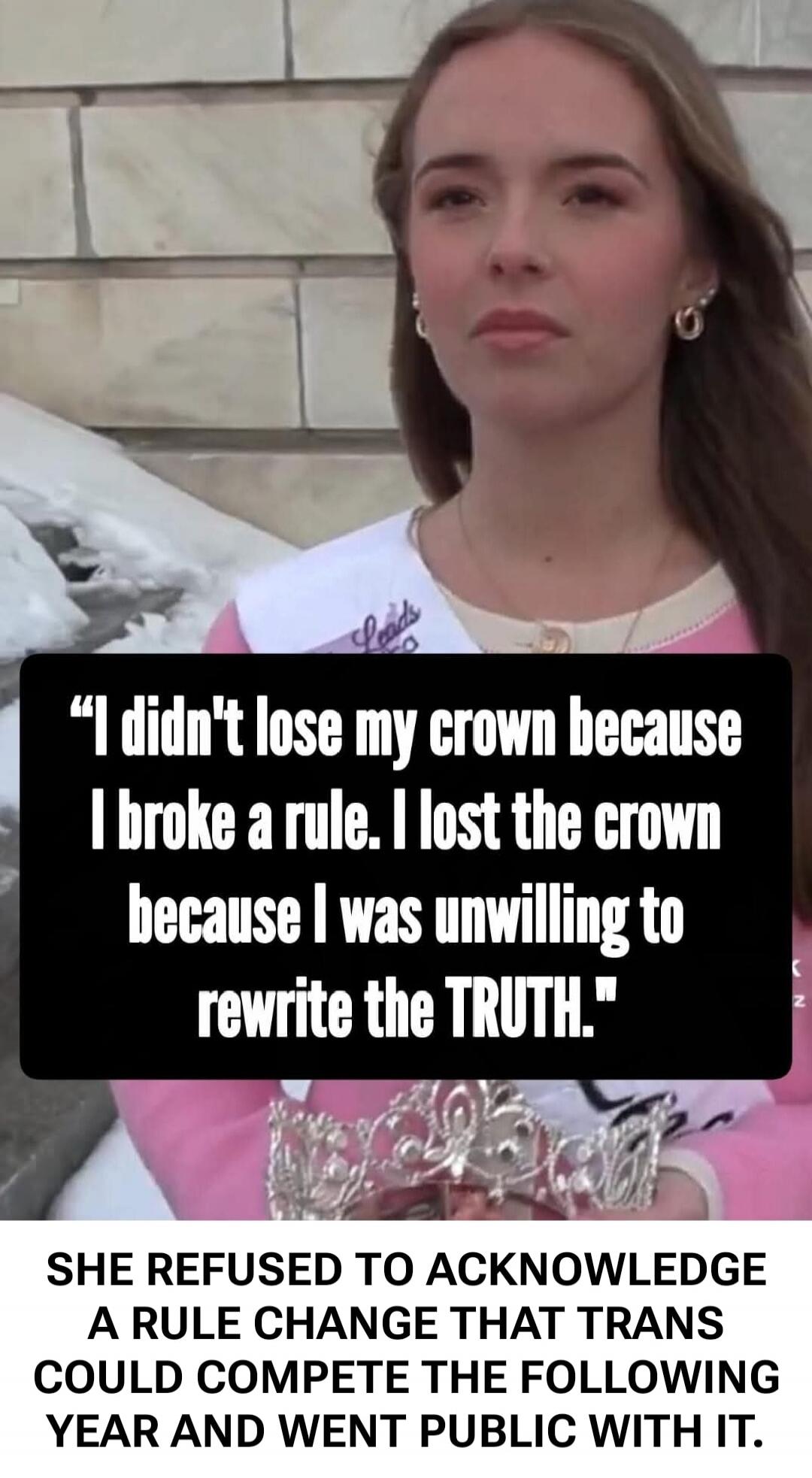 "I didn't lose my crown because I broke a rule. I lost the crown because I was unwilling to rewrite the TRUTH."