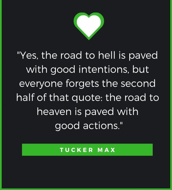 "Yes, the road to hell is paved with good intentions, but everyone forgets the second half of that quote: the road to heaven is paved with good actions." Tucker Max