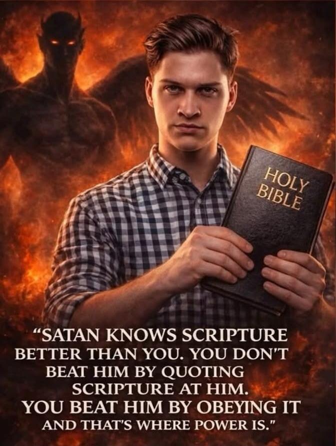 "SATAN KNOWS SCRIPTURE BETTER THAN YOU. YOU DON'T BEAT HIM BY QUOTING SCRIPTURE AT HIM. YOU BEAT HIM BY OBEYING IT AND THAT'S WHERE POWER IS."