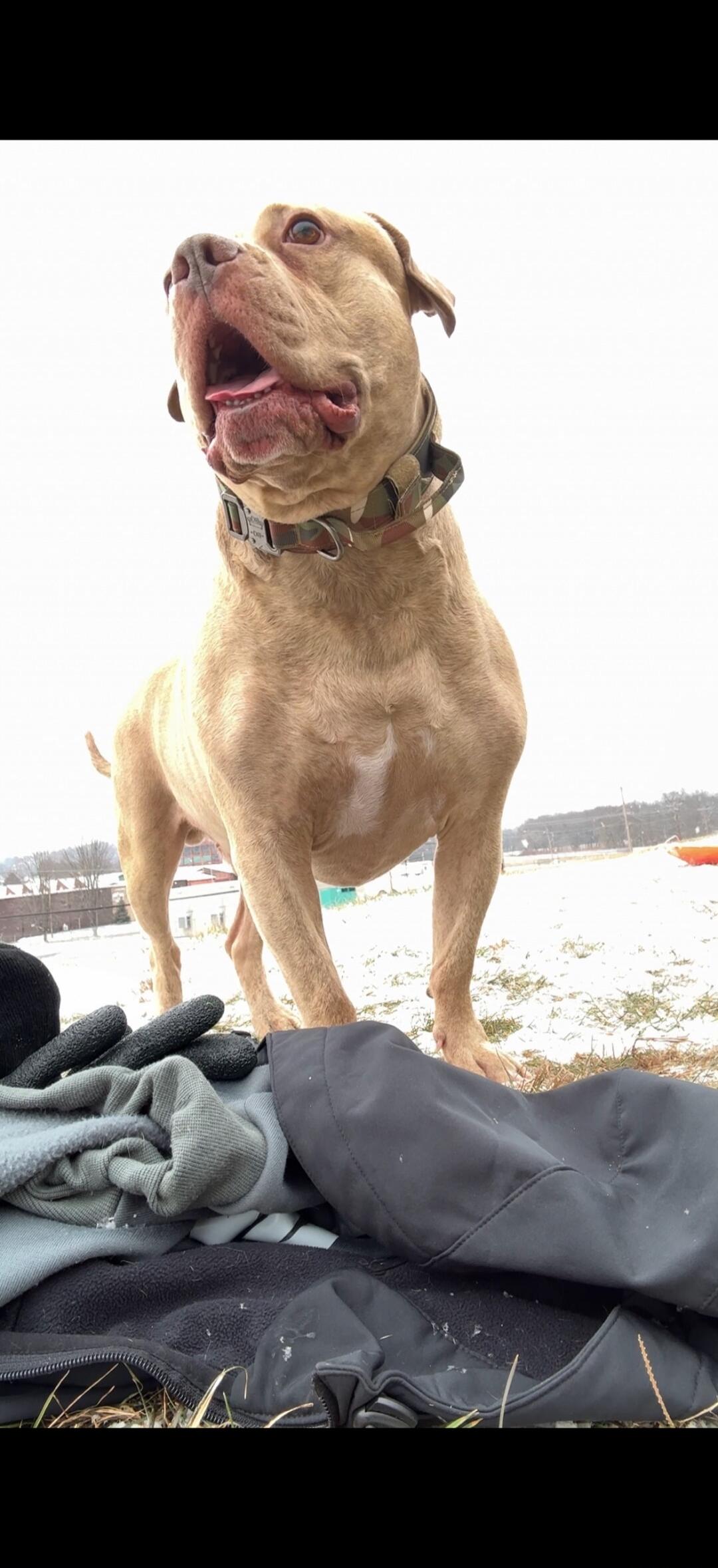 A woman standing outdoors in front of a wooden fence, wearing a black coat, a dark teal top, and ripped jeans with snow on the ground and red rock formations in the background.