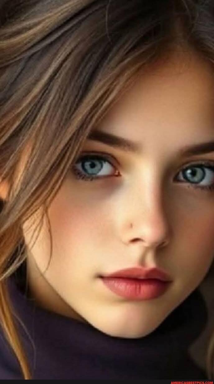 Portrait of a young woman with long red hair and blue eyes.