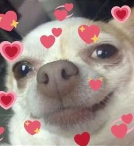 A close-up of a cat with big eyes, holding two roses and surrounded by floating red hearts.