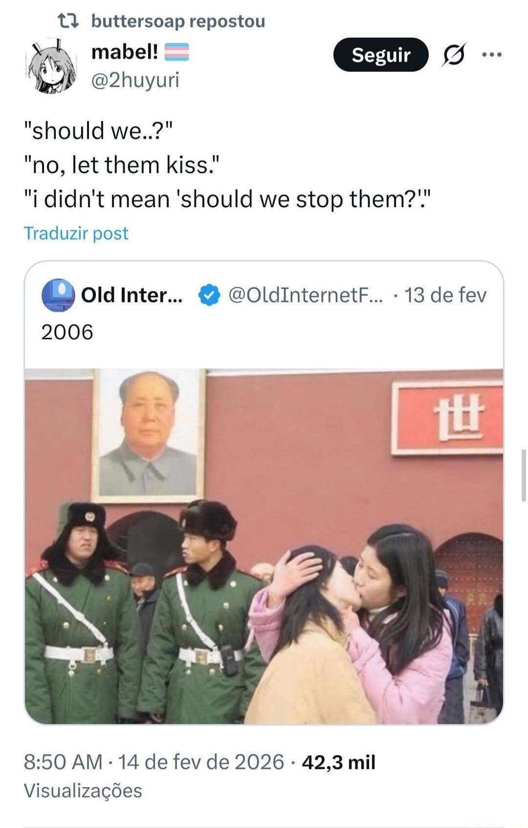 "should we..?" "no, let them kiss." "i didn't mean 'should we stop them?'?" // Old Internet (tweet) 2006: photo of a couple kissing in front of soldiers, captioned with date 13 fev 2006 and 42,3 mil views