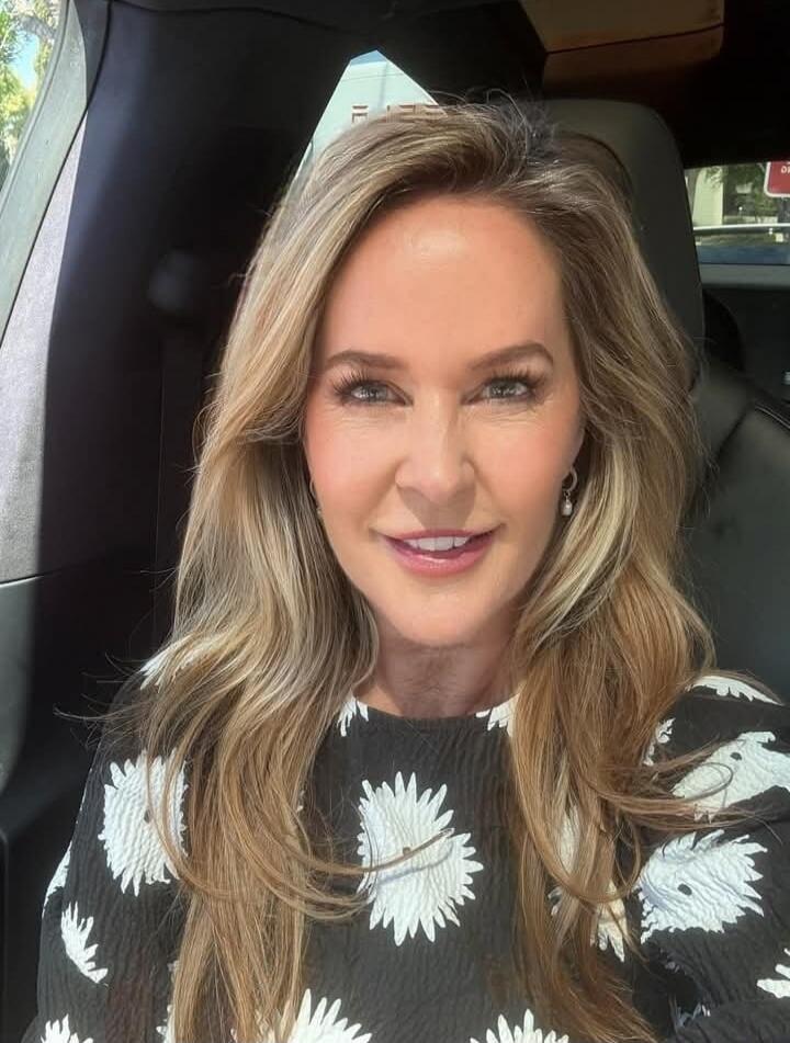 Three young women in military-style uniforms smiling in an office setting. One woman in the center is making a heart shape with her hands. An American flag is visible in the background.