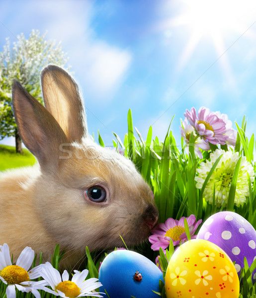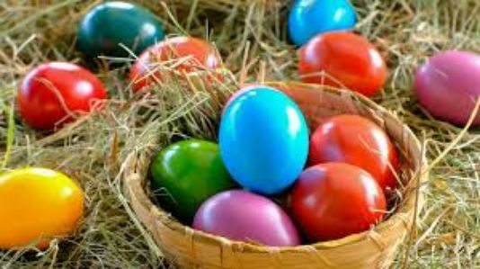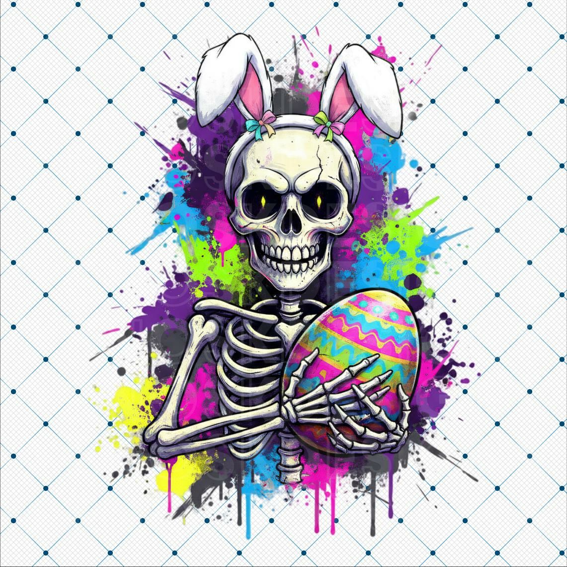 EASTER. A skeleton dressed in a white bunny costume, holding a basket of colorful Easter eggs, with more large decorated eggs behind it.