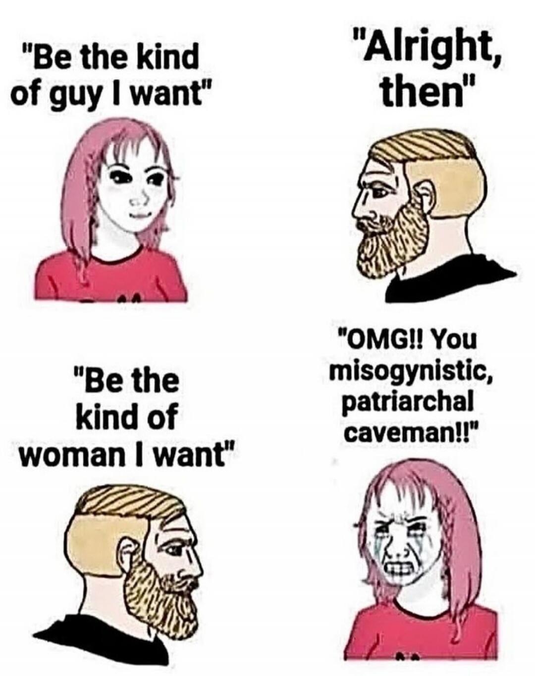 "Be the kind of guy I want" "Alright, then" "Be the kind of woman I want" "OMG!! You misogynistic, patriarchal caveman!!"