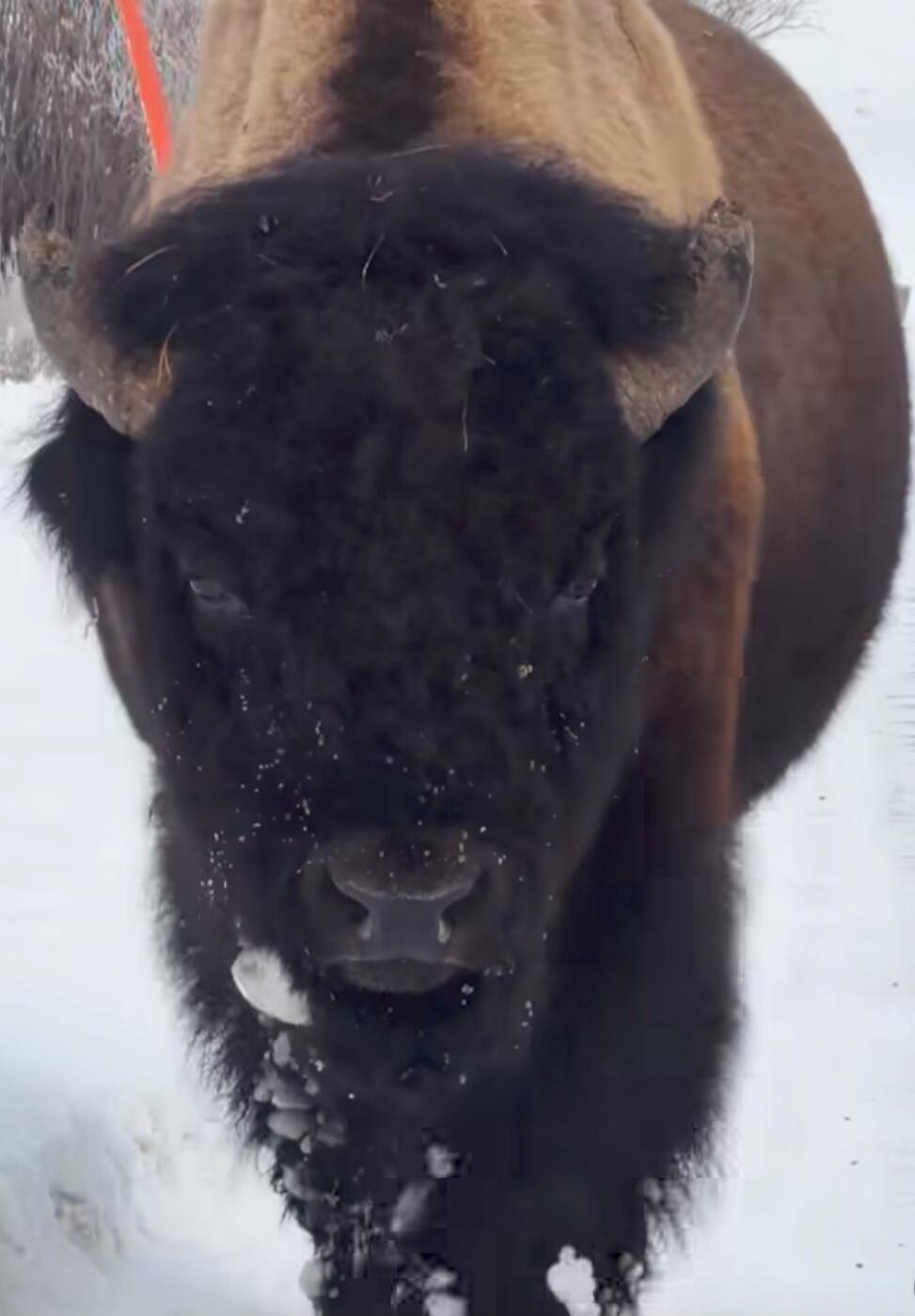 A close-up portrait of a moose with large antlers against a blue sky.