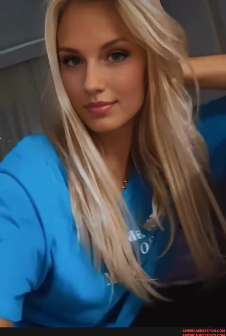 A portrait of a young woman with long platinum-blonde hair wearing a black top.