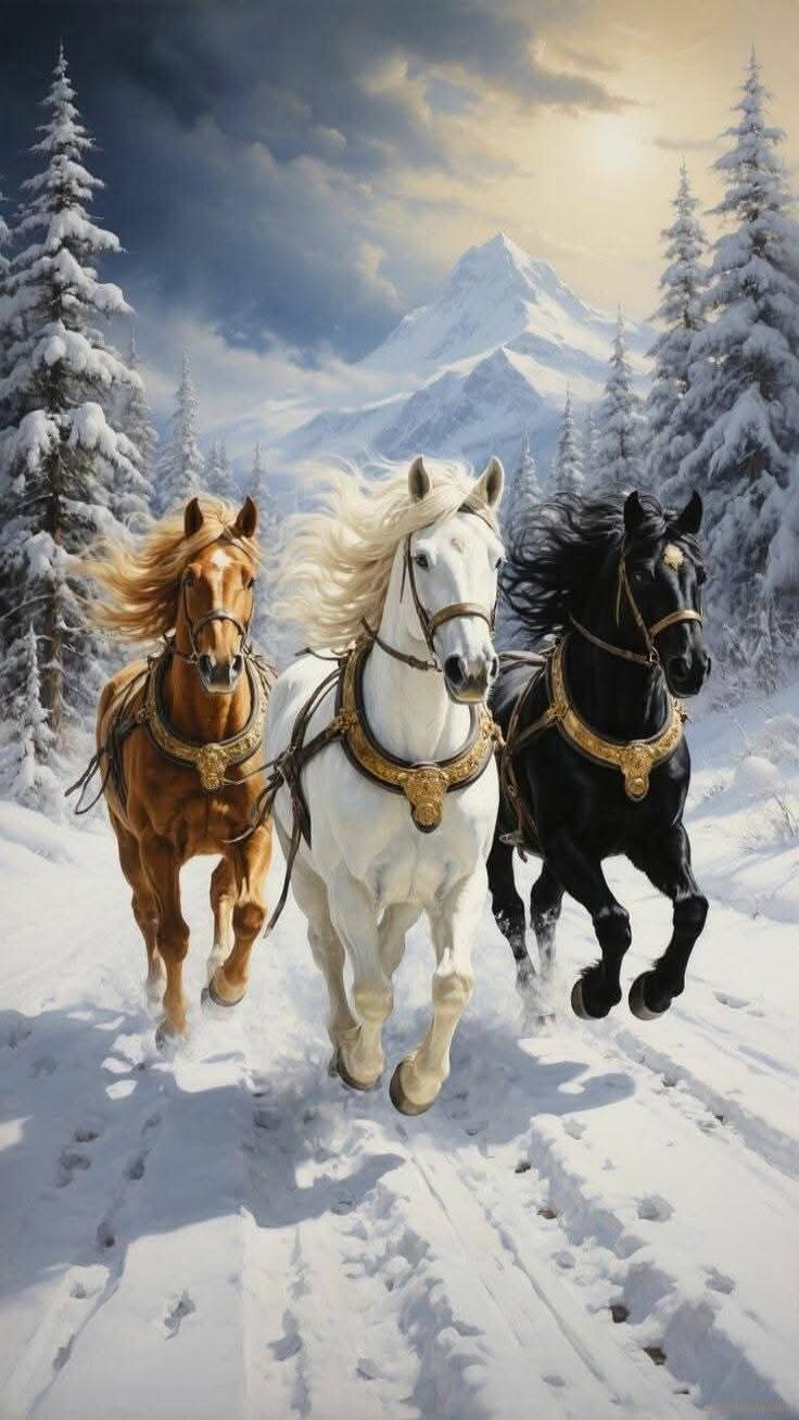 A horse and a dog running on a beach with wet sand and reflections in the water.