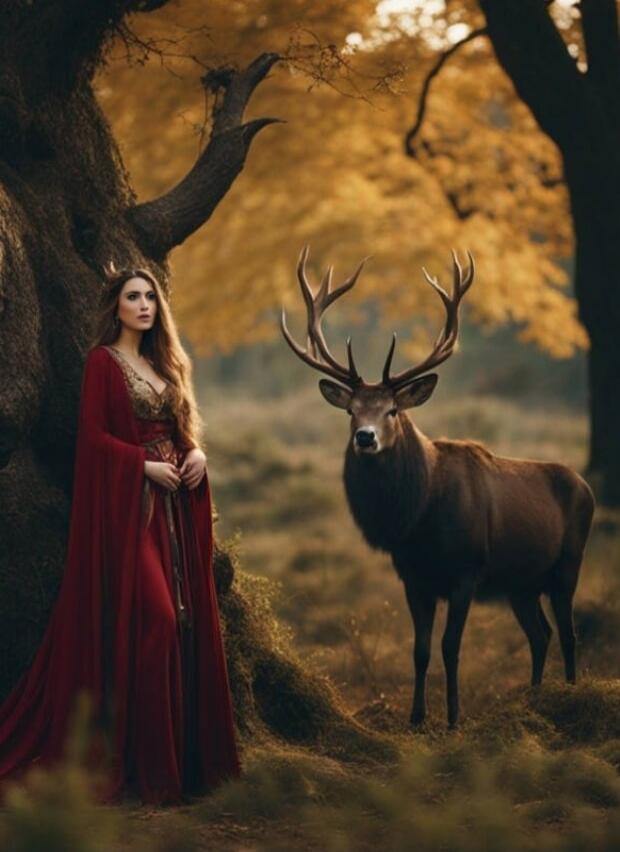 A woman stands in a desert at sunset beside a camel, both silhouetted against the warm sky.