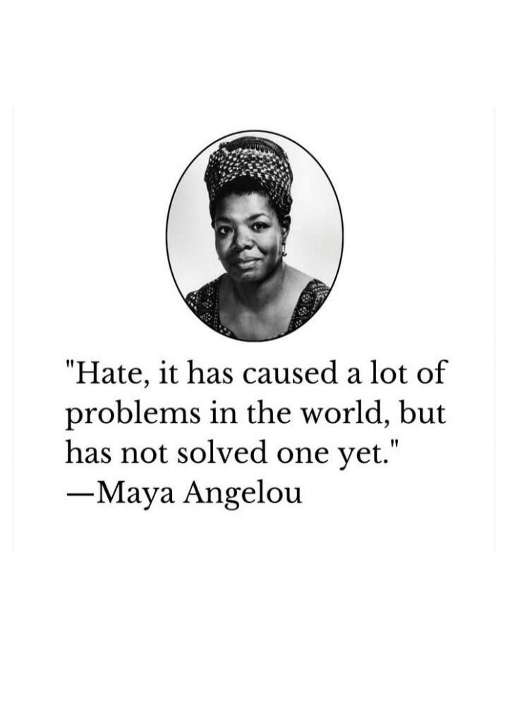 "Hate, it has caused a lot of problems in the world, but has not solved one yet." —Maya Angelou