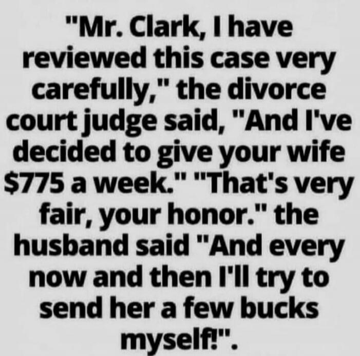 "Mr. Clark, I have reviewed this case very carefully," the divorce court judge said, "And I've decided to give your wife $775 a week." "That's very fair, your honor." the husband said "And every now and then I'll try to send her a few bucks myself!"