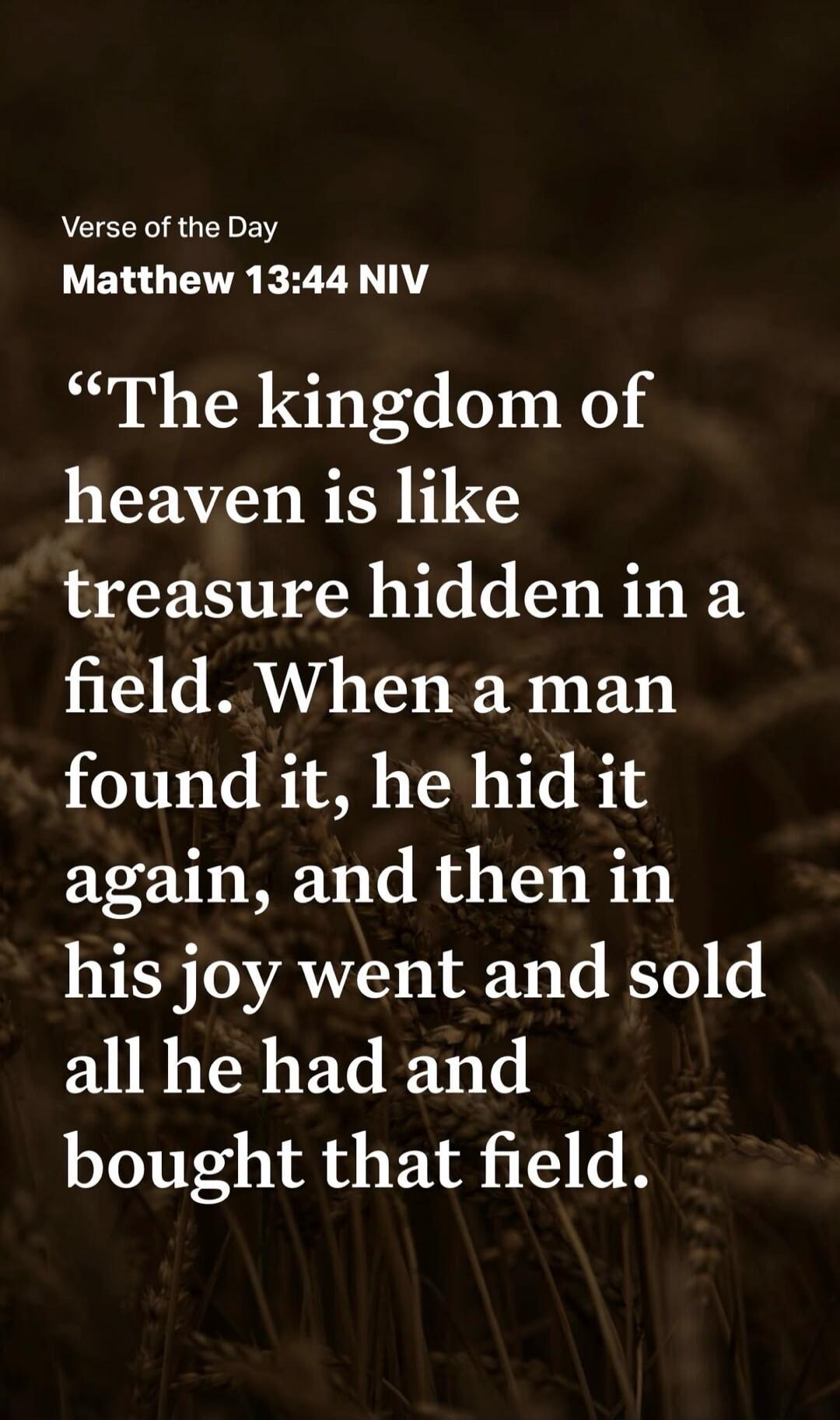"The kingdom of heaven is like treasure hidden in a field. When a man found it, he hid it again, and then in his joy went and sold all he had and bought that field."