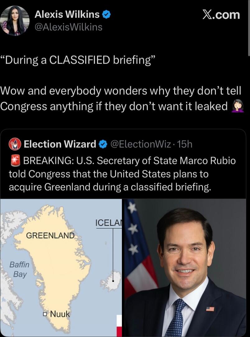 BREAKING: U.S. Secretary of State Marco Rubio told Congress that the United States plans to acquire Greenland during a classified briefing.