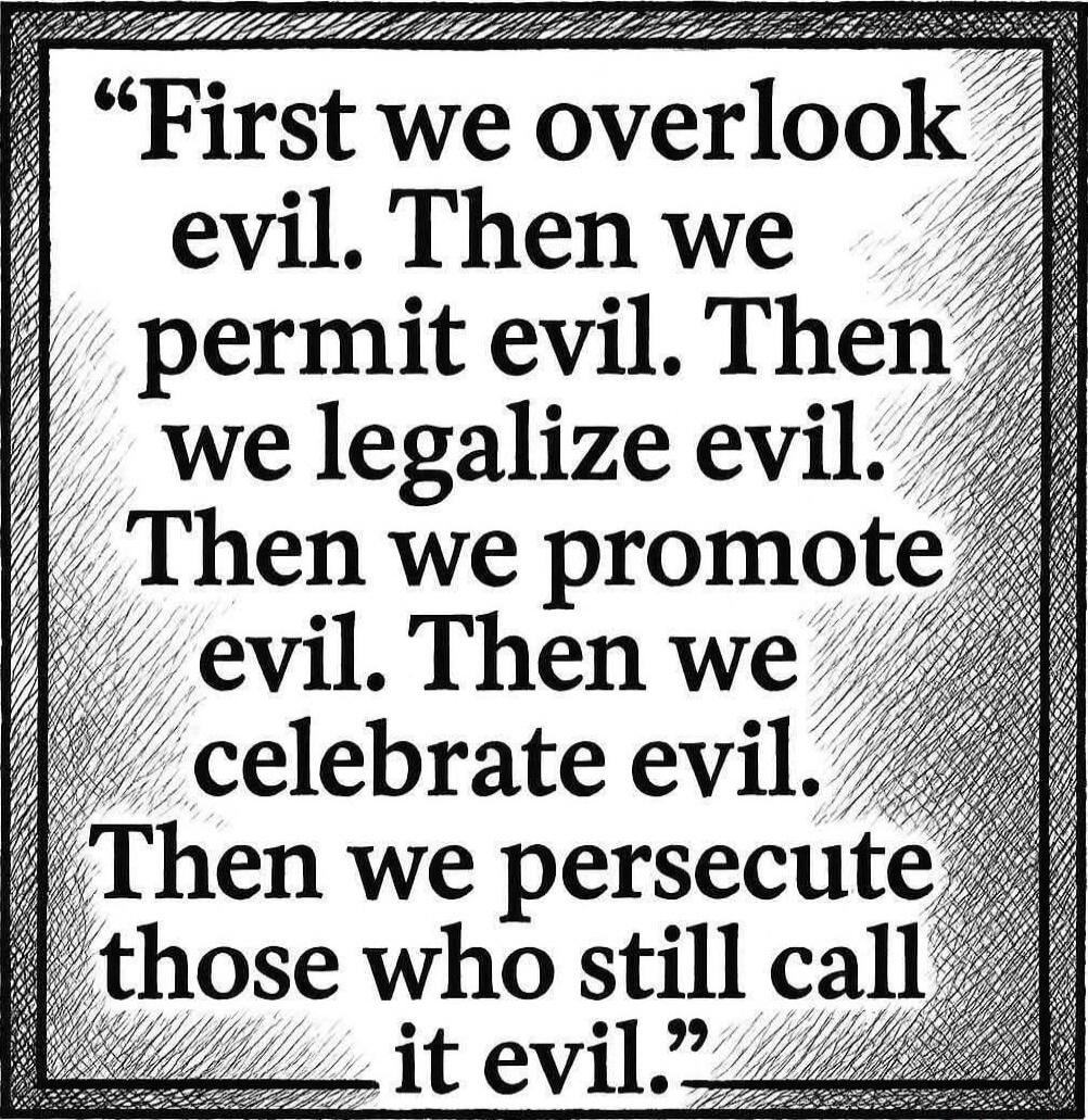"First we overlook evil. Then we permit evil. Then we legalize evil. Then we promote evil. Then we celebrate evil. Then we persecute those who still call it evil."
