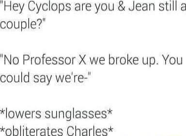 "Hey Cyclops are you & Jean still a couple?" "No Professor X we broke up. You could say we're-" *lowers sunglasses* *obliterates Charles*