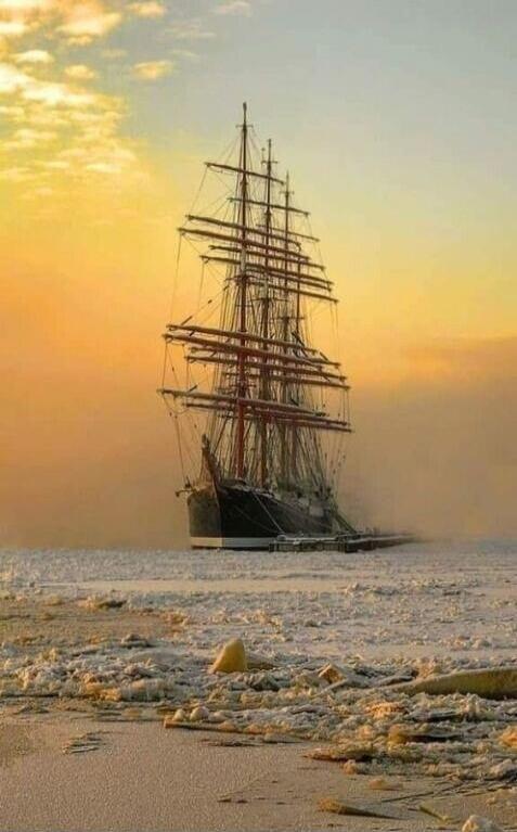 A large sailing ship with multiple masts and orange sails glides on the sea at sunset.