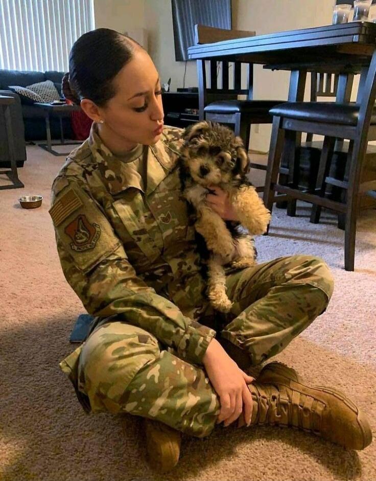 A female soldier in camouflage uniform sitting in a car, posing for a selfie.