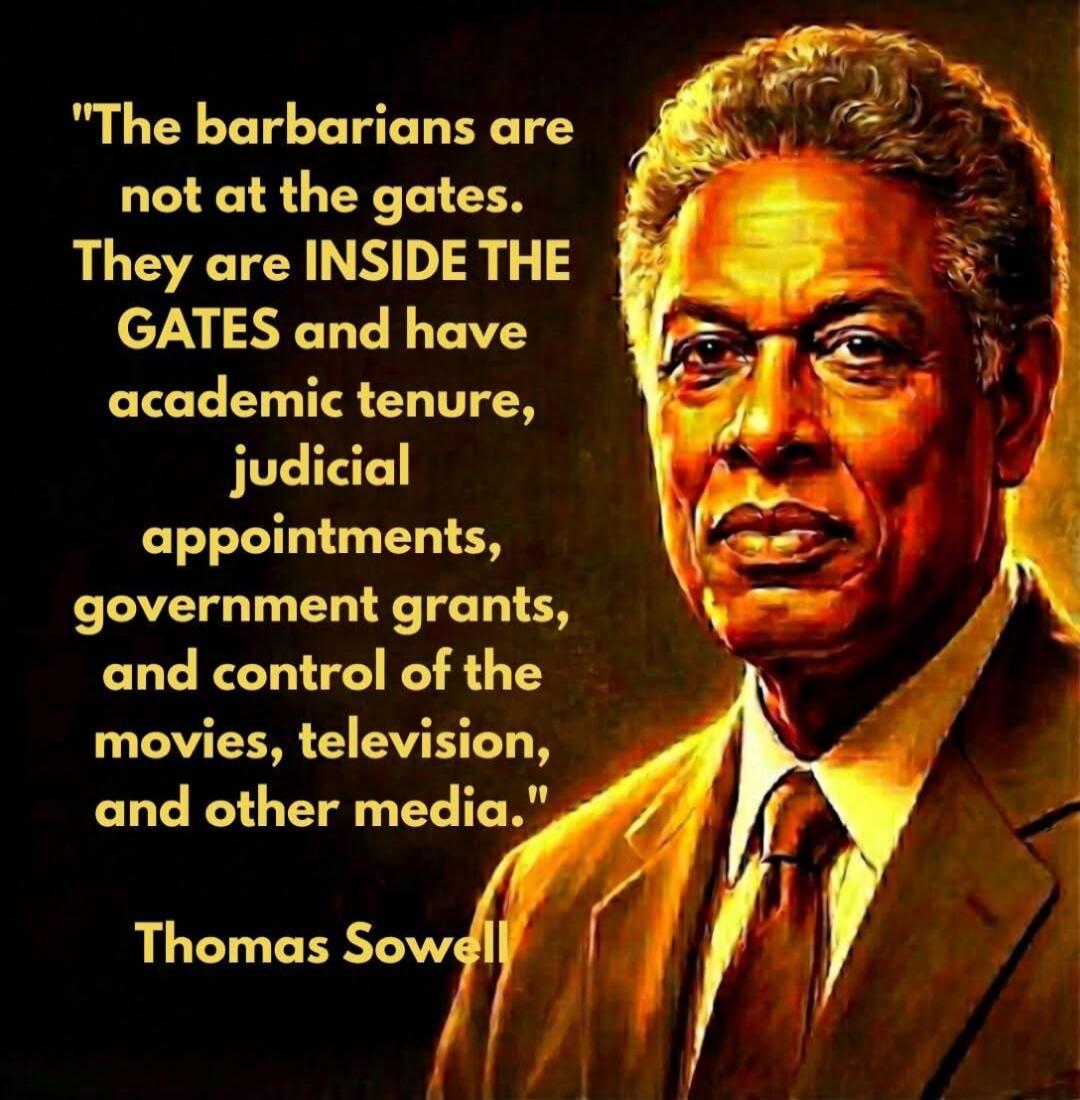 "The barbarians are not at the gates. They are INSIDE THE GATES and have academic tenure, judicial appointments, government grants, and control of the movies, television, and other media." Thomas Sowell