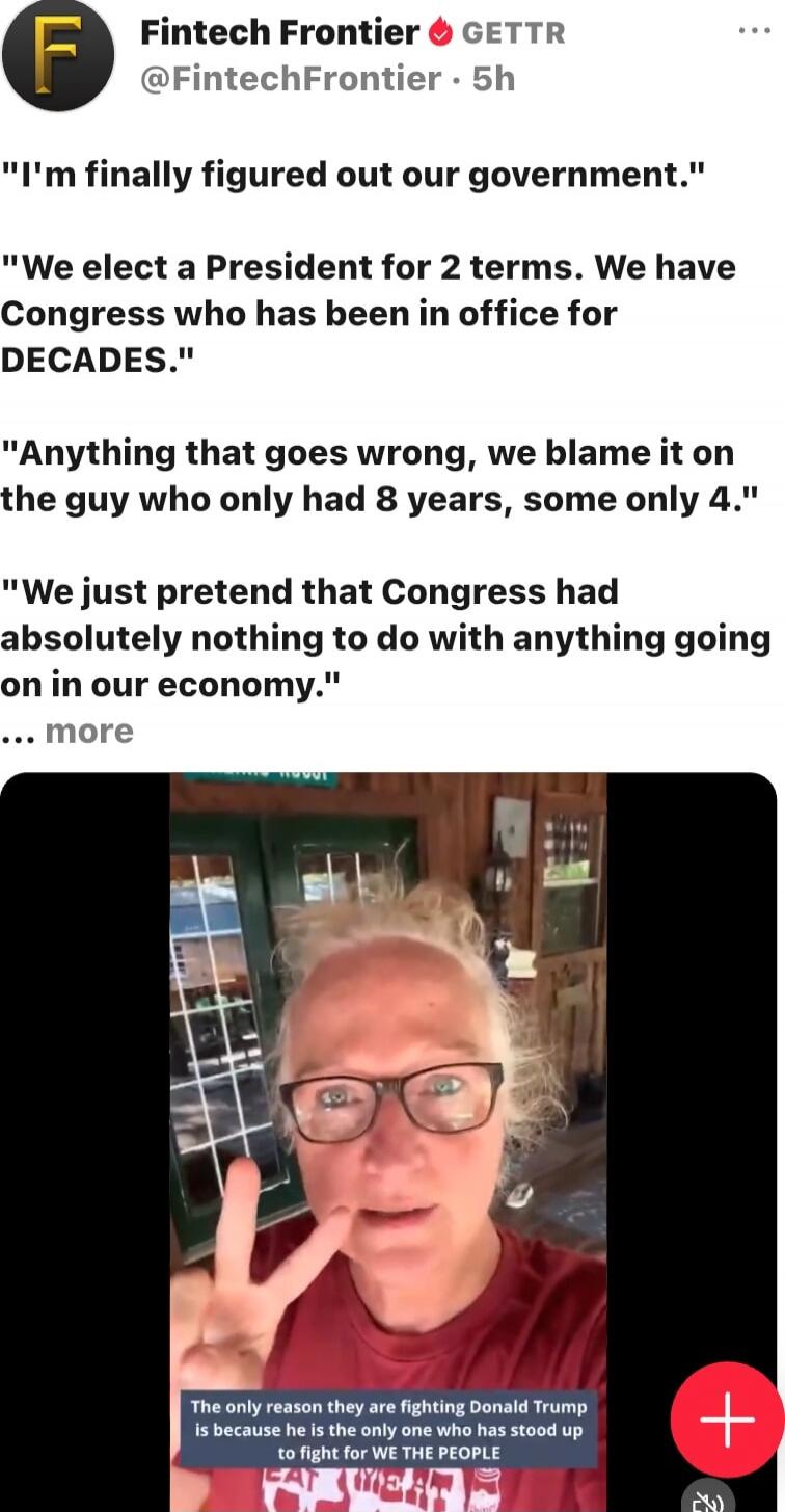 "I'm finally figured out our government." "We elect a President for 2 terms. We have Congress who has been in office for DECADES." "Anything that goes wrong, we blame it on the guy who only had 8 years, some only 4." "We just pretend that Congress had absolutely nothing to do with anything going on in our economy." The only reason they are fighting
