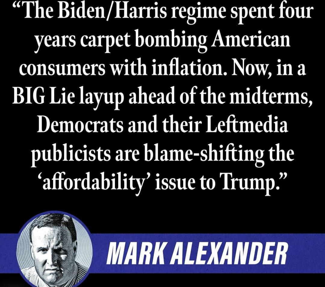 "The Biden/Harris regime spent four years carpet bombing American consumers with inflation. Now, in a BIG Lie layup ahead of the midterms, Democrats and their Leftmedia publicists are blame-shifting the ‘affordability’ issue to Trump.” - MARK ALEXANDER