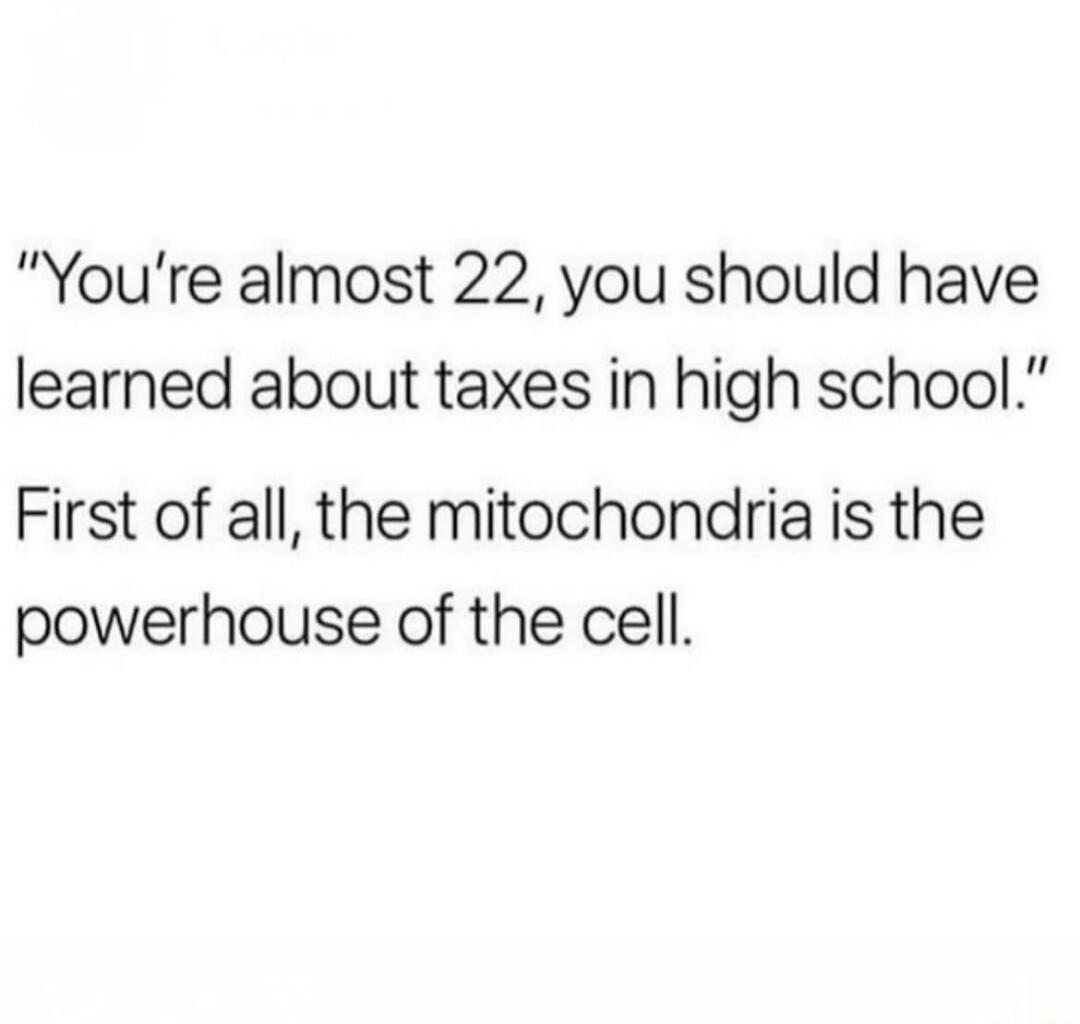 "You're almost 22, you should have learned about taxes in high school." First of all, the mitochondria is the powerhouse of the cell.