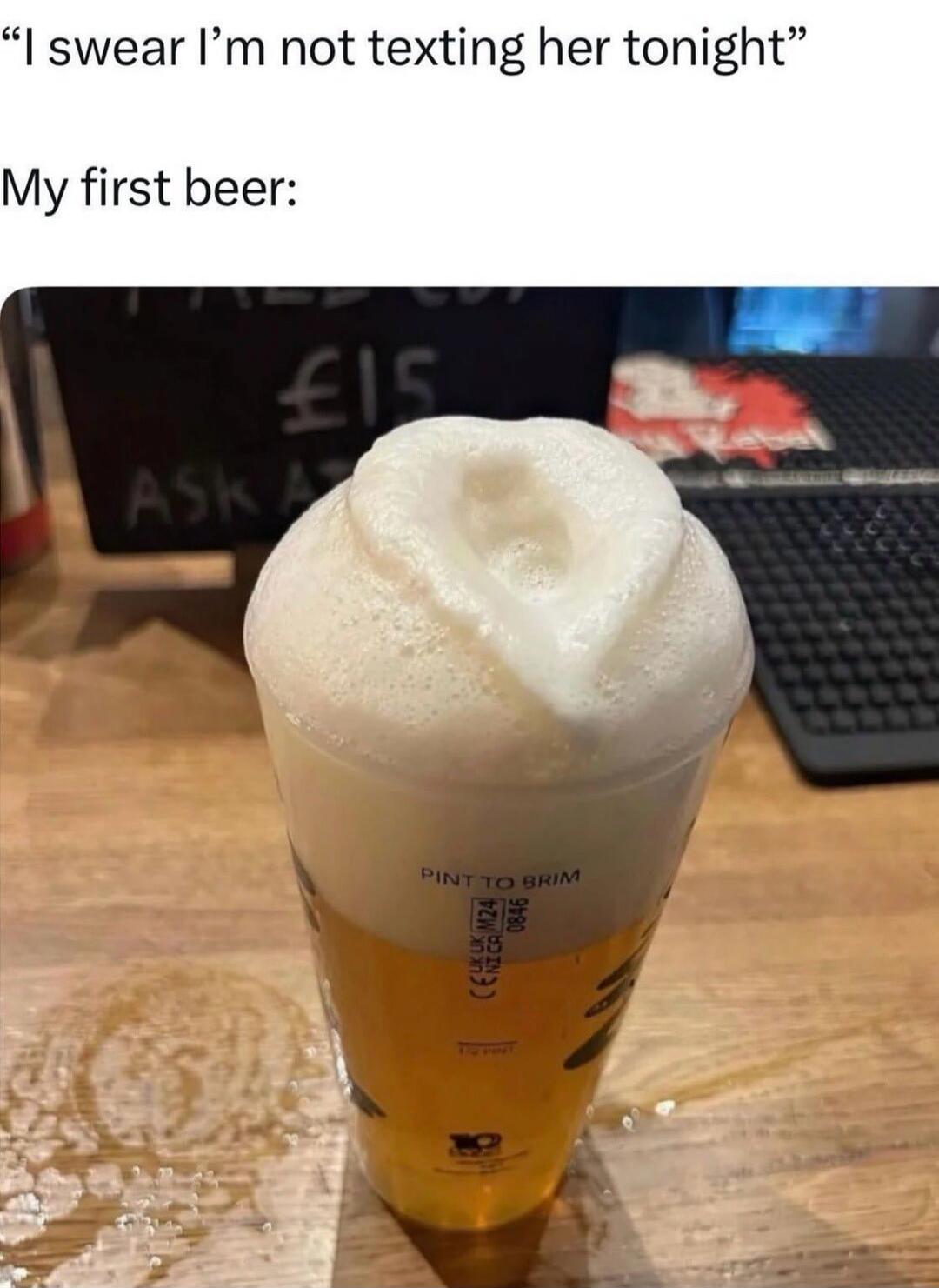 "I swear I’m not texting her tonight"\nMy first beer:\n