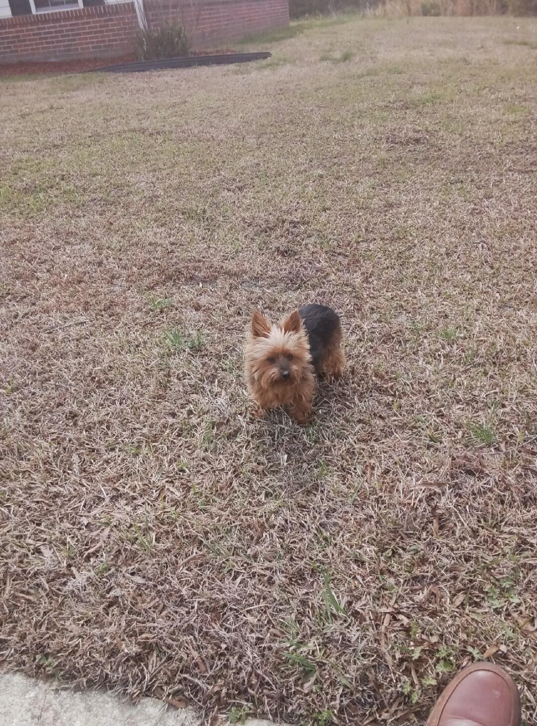 A small Yorkshire Terrier dog stands on its hind legs on a carpeted floor, looking at the camera. A dog bed is visible in the background.