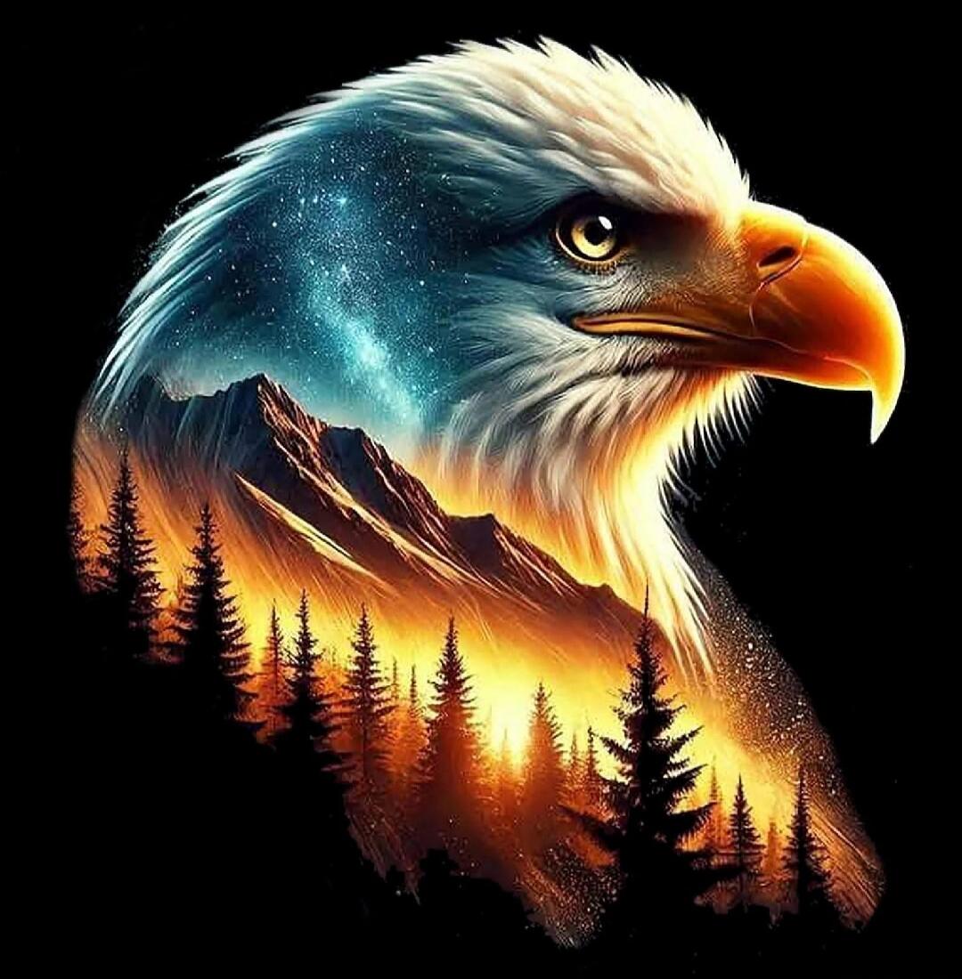 An American bald eagle with chains on its talons perched on crumpled newspaper pages, with a waving US flag in the background.