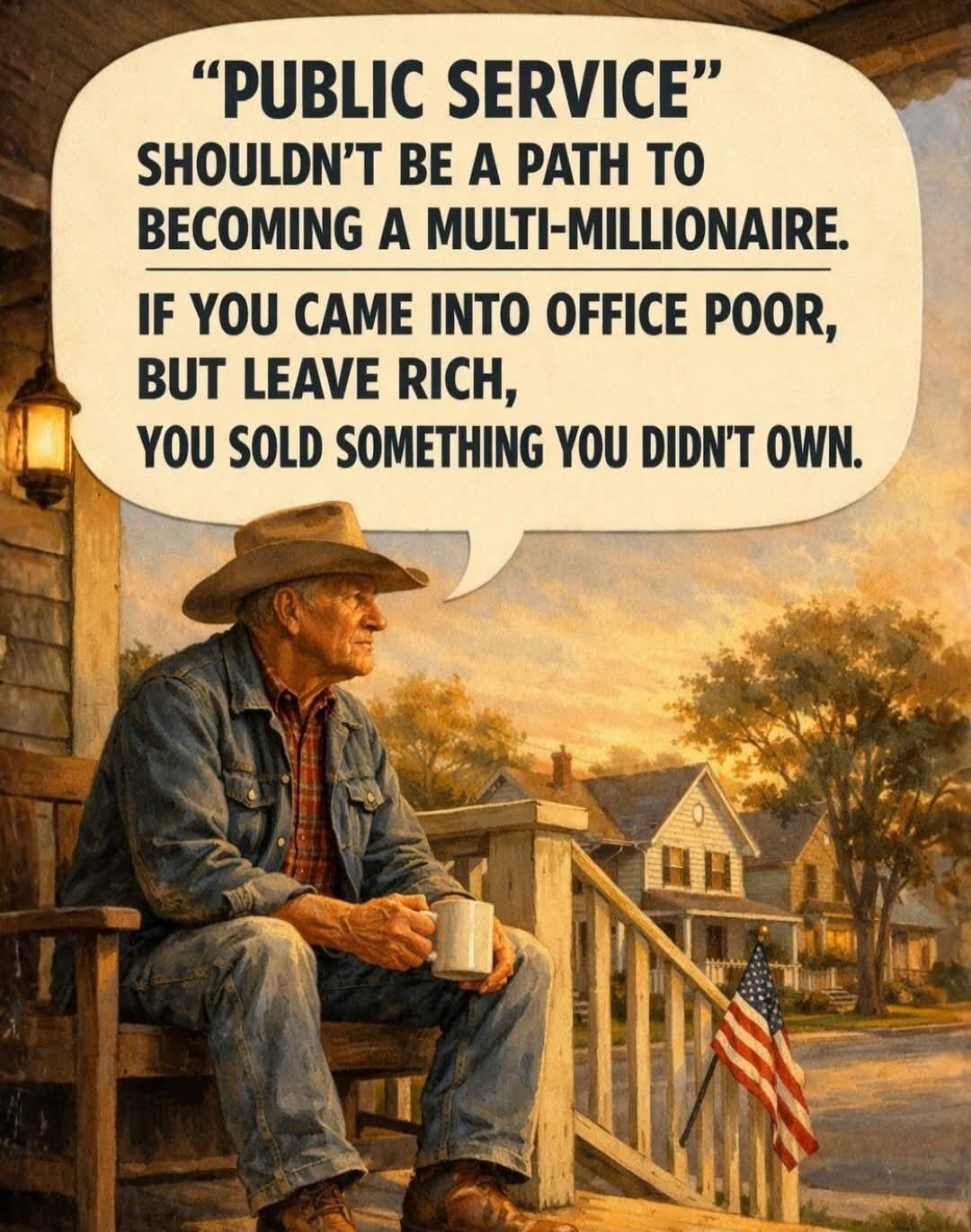 "PUBLIC SERVICE" SHOULDN'T BE A PATH TO BECOMING A MULTI-MILLIONAIRE. IF YOU CAME INTO OFFICE POOR, BUT LEAVE RICH, YOU SOLD SOMETHING YOU DIDN'T OWN.