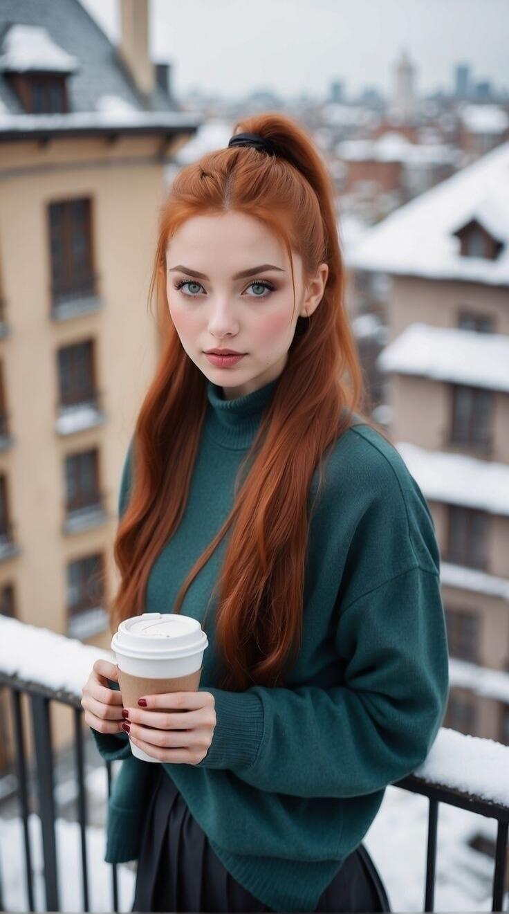 Portrait of a woman with long brown hair wearing a fur coat, with a cup of coffee.