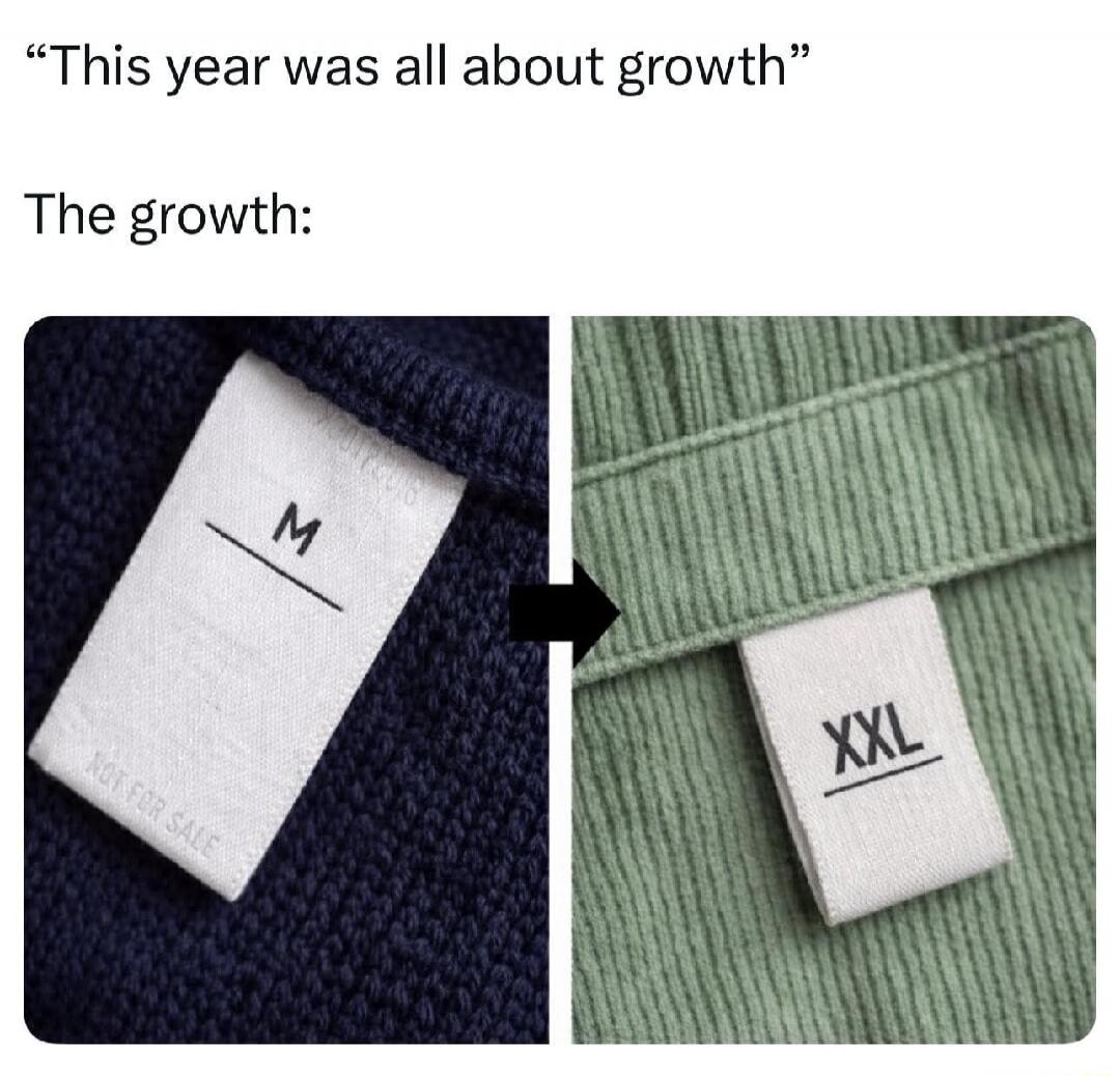 "This year was all about growth" The growth: [left tag shows M, right tag shows XXL]