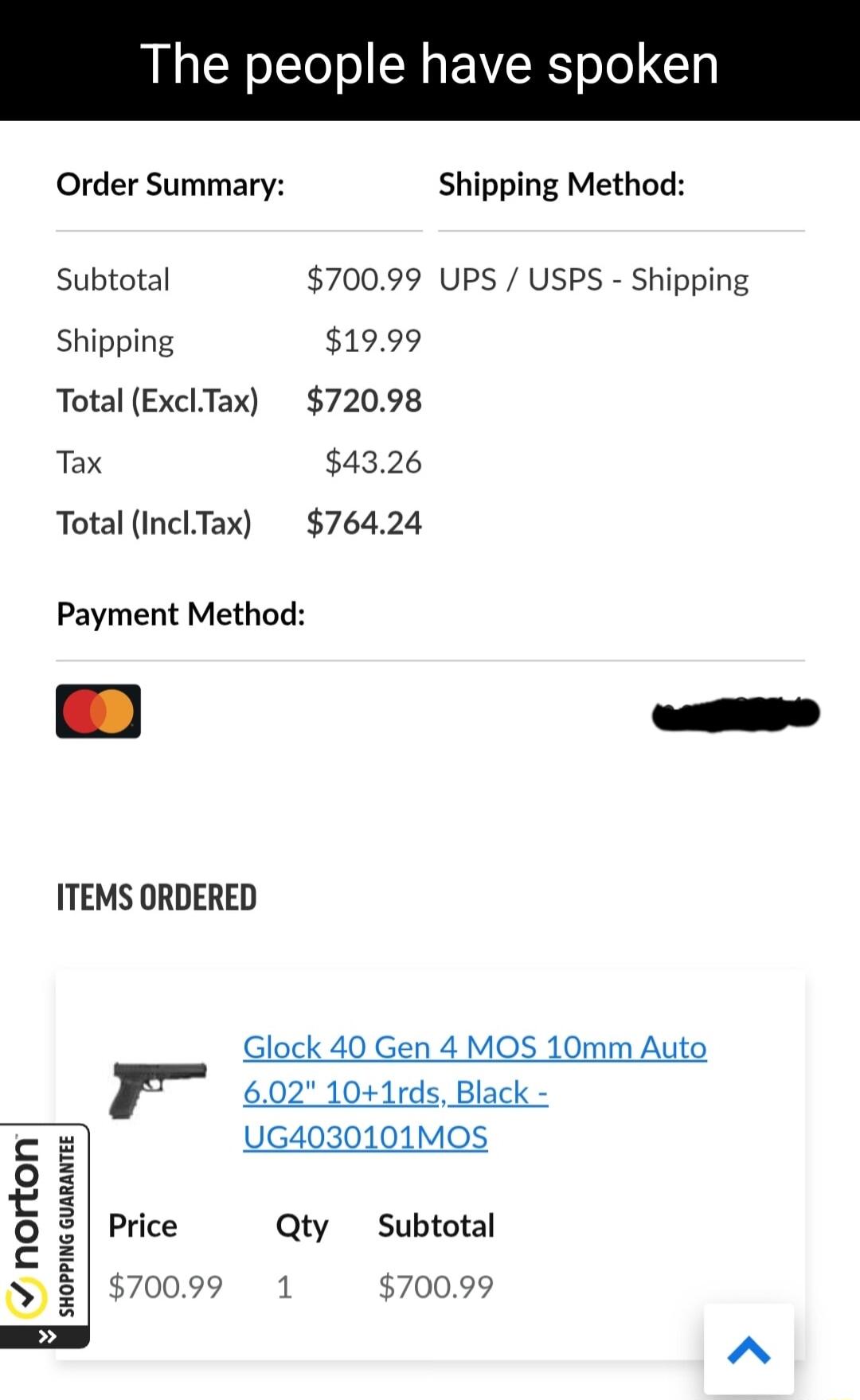 The people have spoken Order Summary Shipping Method Subtotal 70099 UPS USPS Shipping Shipping 1999 Total ExclTax 72098 Tax 4326 Total InclTax 76424 Payment Method ITEMS ORDERED Glock 40 Gen 4 MOS 10mm Auto 602 101rds Black UG4030101MOS Price Qty Subtotal 70099 1 70099 SHOPPING GUARANTEE norton
