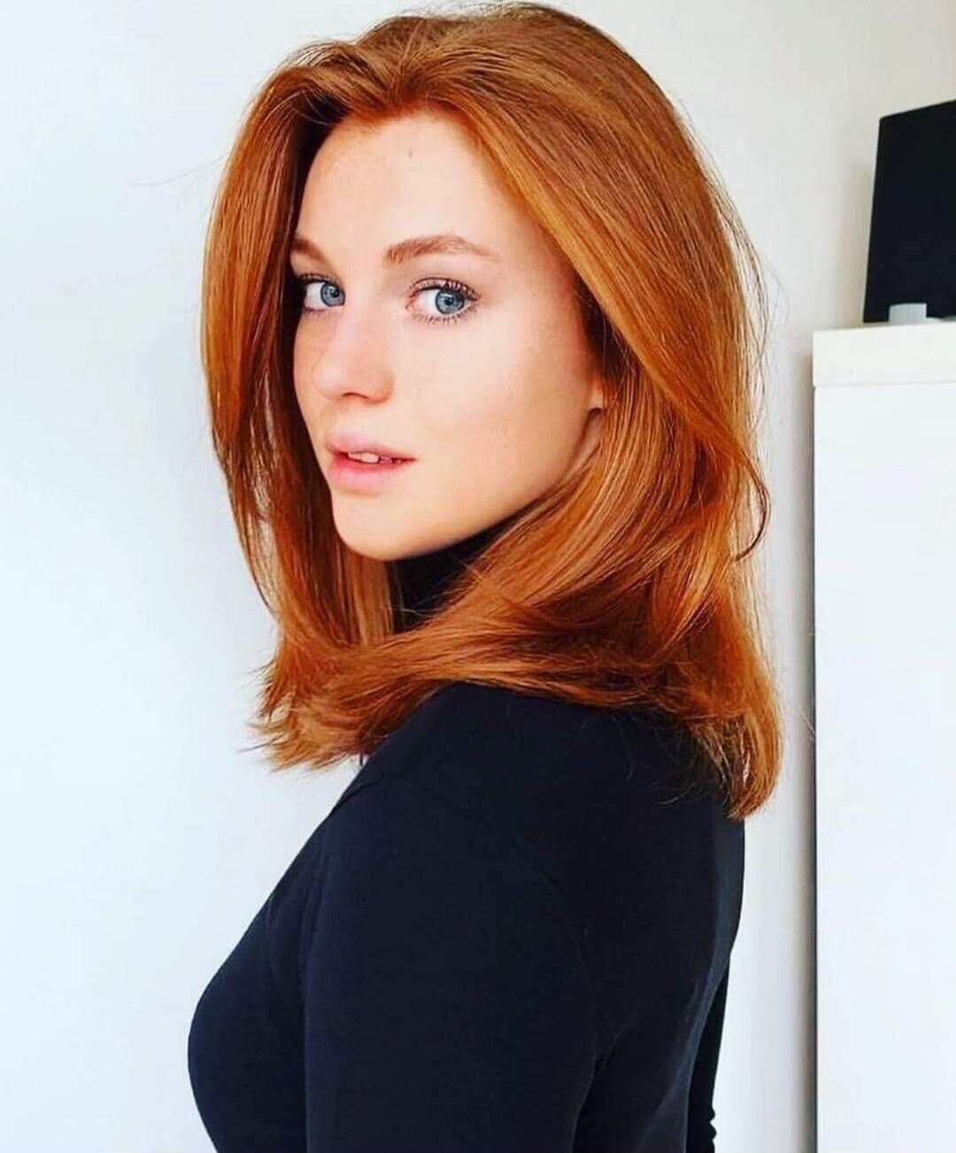 Portrait of a woman with vibrant orange hair.