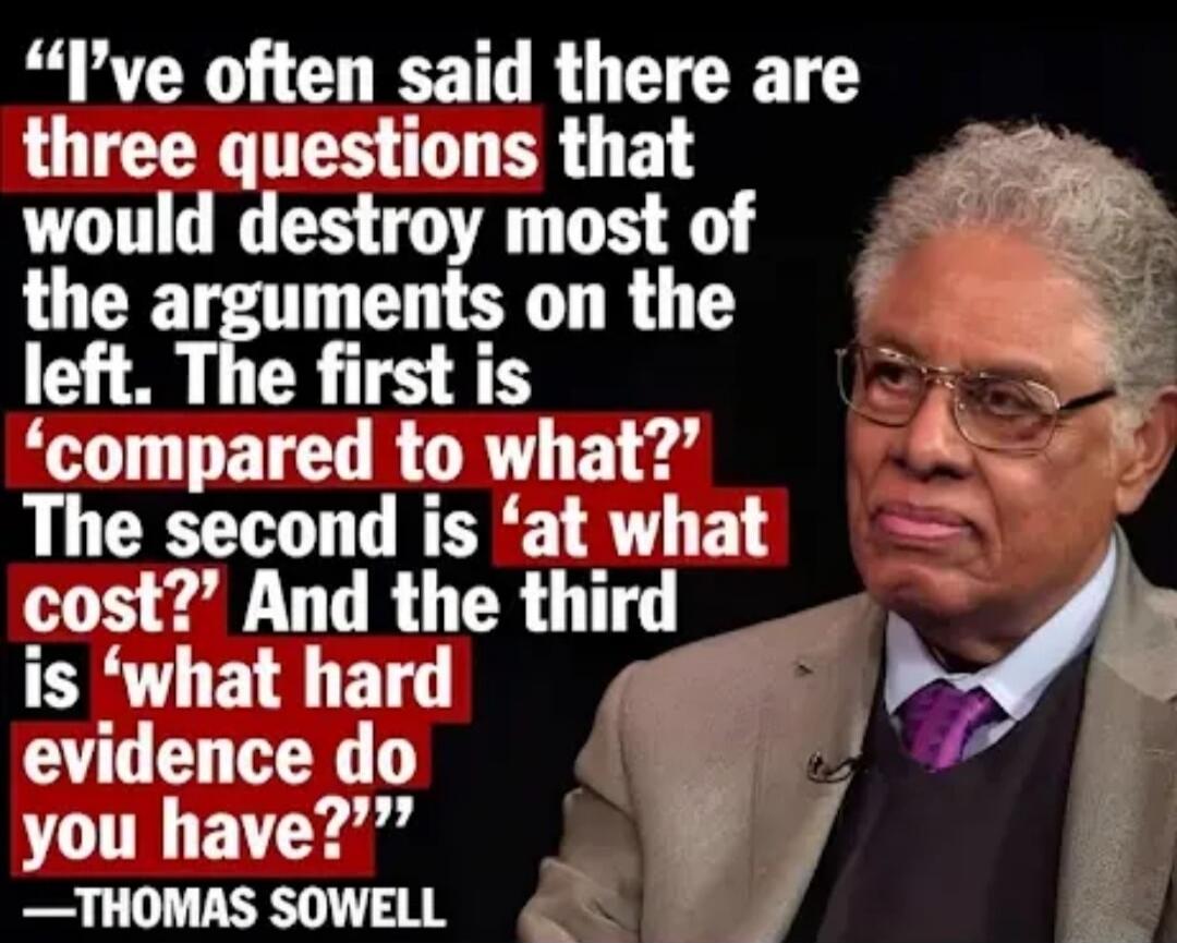 "I've often said there are three questions that would destroy most of the arguments on the left. The first is 'compared to what?' The second is 'at what cost?' And the third is 'what hard evidence do you have?'" — THOMAS SOWELL