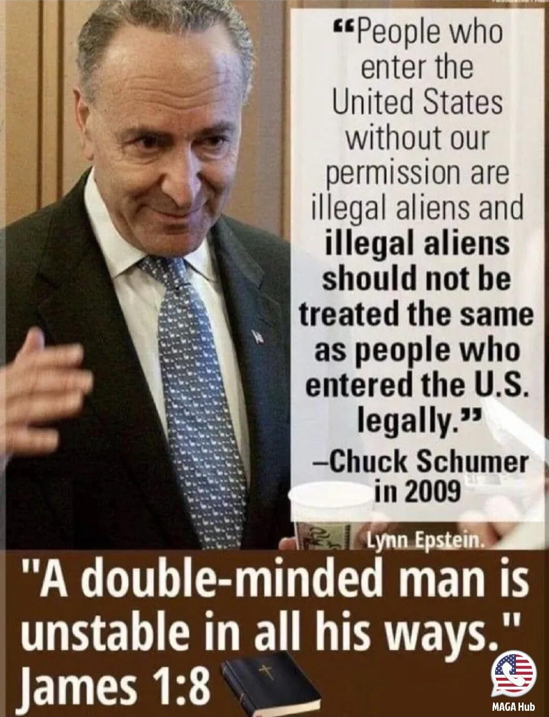 "People who enter the United States without our permission are illegal aliens and should not be treated the same as people who entered the U.S. legally." "A double-minded man is unstable in all his ways." James 1:8