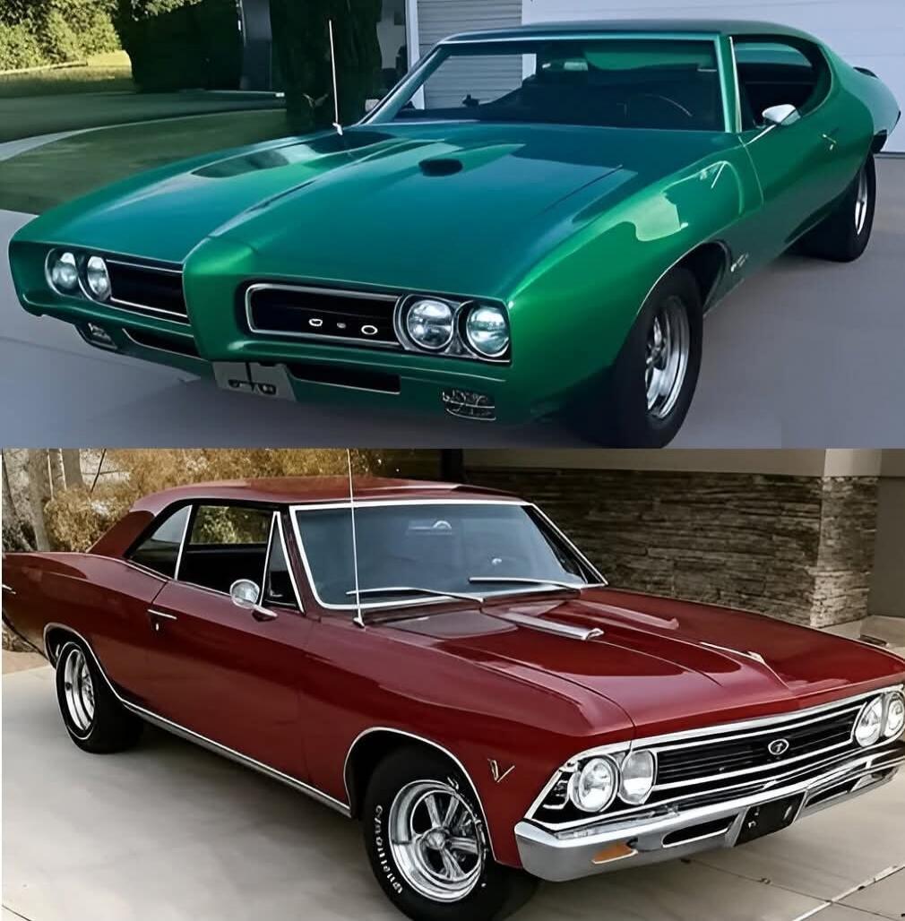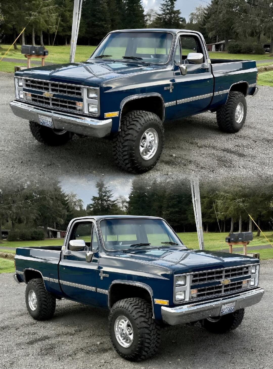Two lifted classic Chevrolet trucks: a tall, chrome-front pickup with oversized off-road tires on top, and a darker gray/blue pickup with a red pinstripe on the bottom, both with lifted suspension and large wheels.