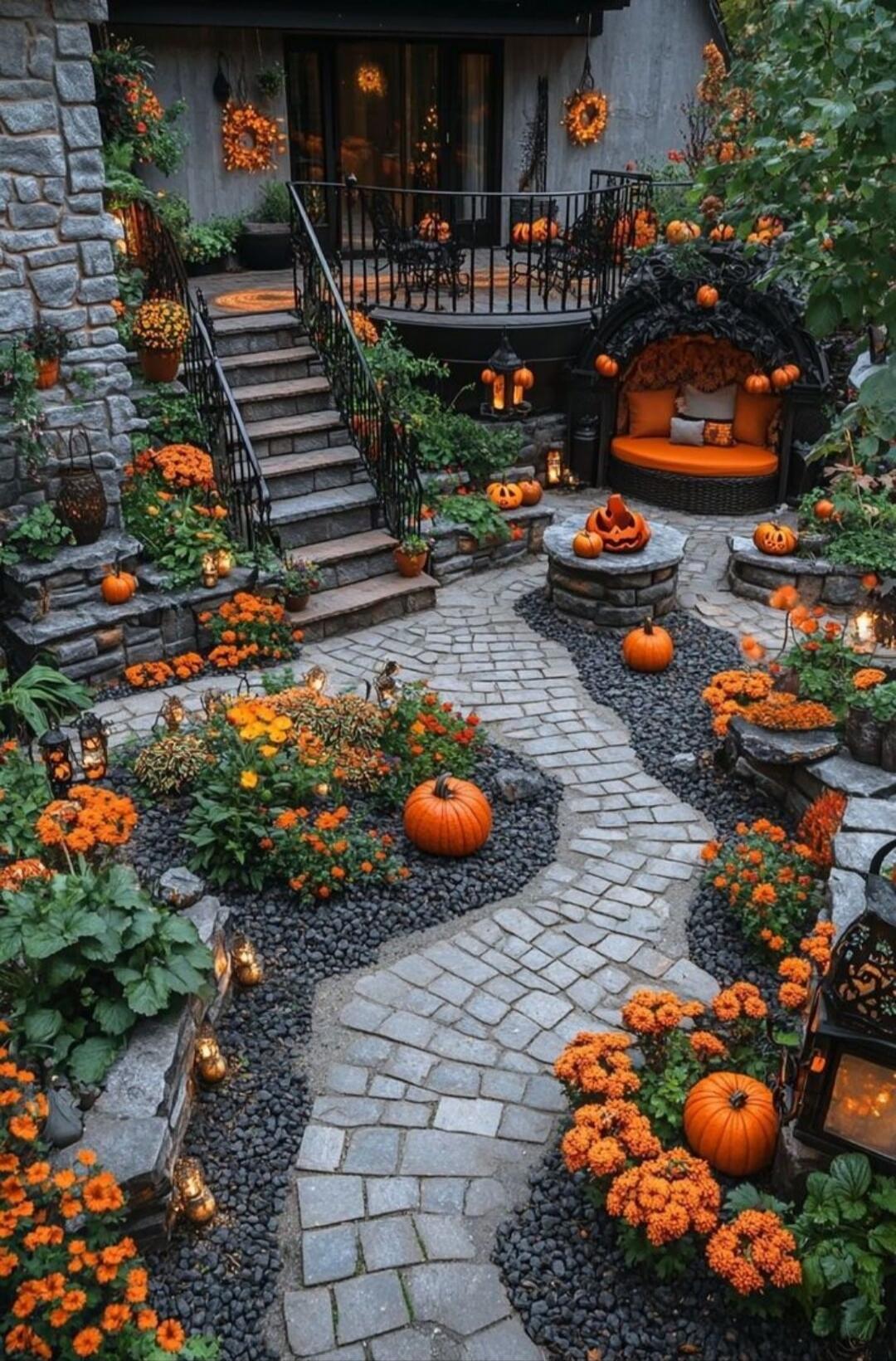Two small black fox kits sleeping among pumpkins and autumn leaves.
