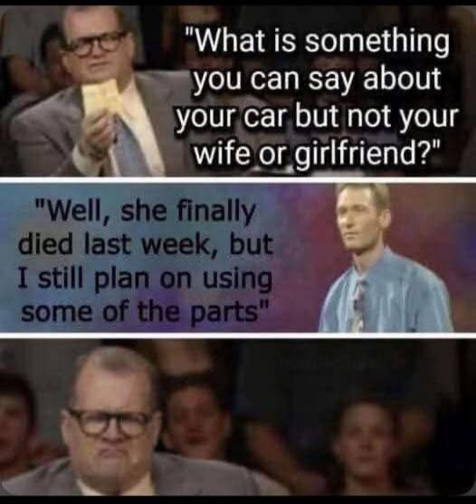 "What is something you can say about your car but not your wife or girlfriend?" "Well, she finally died last week, but I still plan on using some of the parts"
