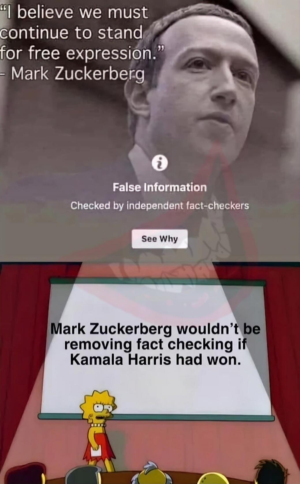 "I believe we must continue to stand for free expression." — Mark Zuckerberg False Information Checked by independent fact-checkers See Why Mark Zuckerberg wouldn’t be removing fact checking if Kamala Harris had won.