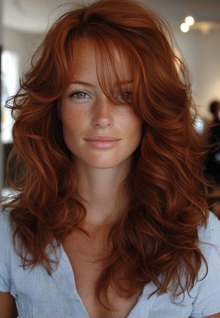 Portrait of a young woman with red curly hair and makeup.